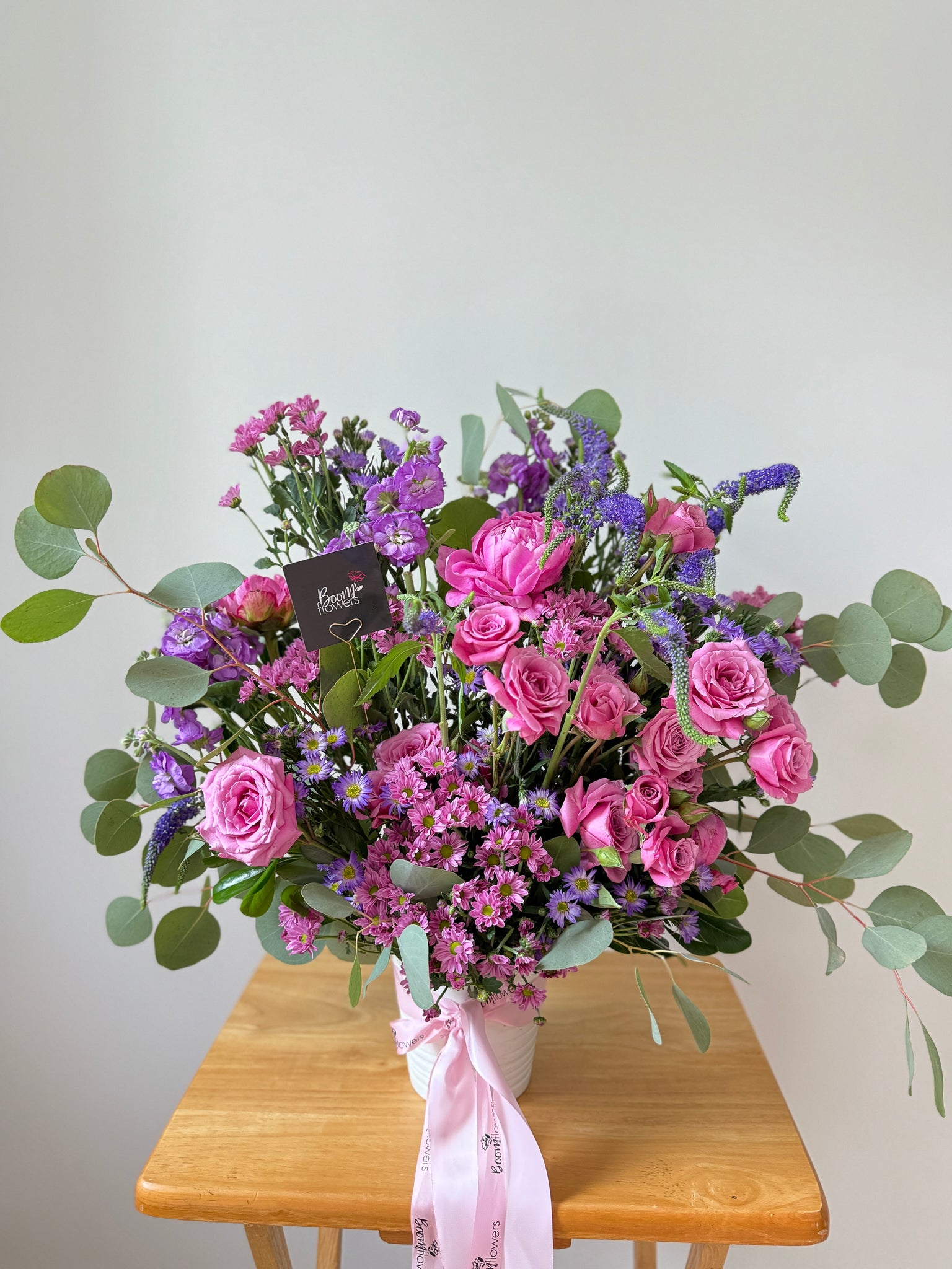 This bouquet features fresh flowers paired with greens, arranged in a garden-inspired style. Each bouquet is meticulously handcrafted with our latest selection of weekly seasonal flowers, guaranteeing a unique and exceptional creation every time.